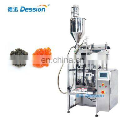 Automatic Caviar Packaging Machine With Liquid Packing Machine Working Video LinkPlease click https://youtu.be/zGW1Po5iP44 Product Description Main Features*Computer control and English-Chinese touch screen for easy operation without stopping the unit.*Intelligent PID temperature controller for easy adjustment and good application to various laminated film and paper.*Packaging diversification, such as back-seal bag, side gusseted bag, linked bag, hole punched bag etc.*Full automation from bag making, measuring, filling, sealing, counting and date printing. Automatic Pouch Weighing And Packing Machine Combination includes: 1) Main Engine ITEMDS-320LDS-420LDS-520LDS-720LFilm WidthMax.320mmMax.420mmMax.520mmMax.720mmBag Length80-240mm80-300mm80-350mm100-450mmBag Width50-150mm60-200mm80-250mm100-350mmFilm Thickness0.04-0.08mm0.04-0.08mm0.04-0.08mm0.04-0.08mmFilm Roll DiameterMax.320mmMax.320mmMax.320mmMax.320mmPacking Speed5~70 bags/min5~60 bags/min10-50 bags/min10-40 bags/minPower220V, 50/60HZ, 2.0KVA220V, 50/60HZ, 2.2KVA220V, 50/60HZ, 3KVA220V, 50/60HZ, 3.6KVAMeasurementL)1185 * W)935 * H)1245 mmL)1217 * W)1015 * H)1343 mmL)1488 * W)1080 * H)1490 mmL)1716 * W)1260 * H)1820 mmOptional DeviceDate Coder / Air-filling Device / Punching DeviceMachine PackingWooden BoxWooden BoxWooden BoxWooden Box 2) Metering Pump & Material Feeding Bucket Working Process ApplicationFor materials in liquid shape, e.g. milk, oil, jam, water, etc.Various bag types are available, e.g. pouch, stand-up bag, cheerpack, back-sealing bag, 3 or 4 sides sealing bag, linking bags,etc. Packaging & ShippingPayment: 30% deposit in advance, 70% balance before shipment by T/T.Delivery time: 20-25 days after receiving 30% deposit. Optional Devices 1. Punching device 2. Tear notch device 3. Linking bag control device 4. Air filling device 5. Nitrogen inflation device 6. Code printer 7. Material gathering hopperCompany InformationSince 2005, Dession has been the leading manufacturer of packaging machinery, including pillow type packing machine,vertical packaging machine, automatic feeding line, flowing packing machine and other supporting facilities. During the last 10 years, Dession has more than 30 partners all over the world. Our packing machines have been shipped to various countries and areas, such as America, Brazil, Russia, British, Germany, India, Thailand, Malaysia, Vietnam and so on. DS-250X Speghetti Packing Machine DS-320Y Honey Sachet Packing Machine DS-420BZ Frozen Peas Packing Machine Contact usFor more information, please contact us by email or instant messages. Any email or message will be answered within 12 hrs. Automatic Caviar Packaging Machine With Liquid Packing Machine
