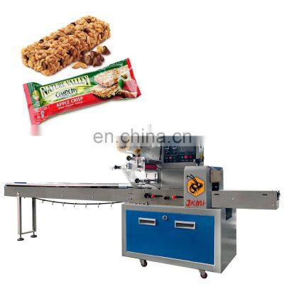 JKMF New Version Automatic Flow Candy / Chocolate / Energy / Granola / Protein Bars Packing MachineProducts DescriptionThe JK-B model flow packing machine features quick, easy changeover and adjustment that minimizes product and film waste and reduces maintenance costs.The machine working starts with a cylindrical roll of film. The flow wrapping machine will transfer the film from the roll and through to the forming collar (sometimes referred to as tube or plow). At the same time, a conveyor has lined up individual products for wrapping. The film is fed through the collar and the product is surrounded with film, sealed and the film is then cut. The finished individual product is then gathered downstream to be bagged or cartoned prior to boxing and palletizing.Automatic flow packing machine is a widely used packing machine. Suitable for all kinds of product packaging. Including medical supplies, vegetables and meat, baked bread, snacks and candy, daily necessities, hardware accessories, etc.Main Features1.Dual frequency conversion control, Bag length can be set and cut in one step, saving time and film.2.Interface features easy and quick setting and operation.3.Self failure diagnosis, clear failure display.4.High sensitivity photoelectric eye color tracing, numerical input of cutting sealing position for extra accuracy.5.Temperature independent PID control, more suitable for packaging different materials.6.Positioned stop function, without sticking knife or wasting film.7.Simple driving system, reliable working, convenient maintenance.8.All control is realized through software, easy for function adjusting and technical upgrade.Machine Working Process1st step: Put the packaging film on the holder and wear the film as required.2nd step: Setting the parameters you want by touch screen.3rd step:Put the materials to be packed on the conveyor belt4th step: The bag former will make the bag automatically.5th step: The horizontal and vertical cutter device will seal the middleand of the bag.6th step: You will get the nicely paper or plastic bag type.Why Choose UsJIKE BEE MACHINERY has a professional team to provide customers with various packaging solutions. Fully understanding the needs of customers,engineers design the most suitable solution. We have our own processing and assembly workshop and quality inspection and debugging process to ensure the quality of the machine. After acceptance by the customer, they are packed in international standard wooden cases and shipped.We will package the machine's instruction manual and a USB flash drive with machine operation videos together with the machine.Ensure that you can use the machine as soon as you receive it. If you have something you don't understand, our after-sales team will also help you answer in time.Our customers have covered more than 80 countries around the world.And give us unanimous praise.Company ProfileFoshan Jike Bee Automation Equipment Co., Ltd. is a manufacturer of automatic packaging equipment.We are a production-oriented enterprises focused on product innovation, factory direct sales and perfect after-sales service in one.The automatic packaging equipment for granule, powder, liquid and sauce produced by the JKMF company is at the advanced level of the industry,it can be customized production automatic material packaging line for all kinds of products .Mainly applicable to: food, hardware, drugs, daily chemicals, pesticides, fruits and vegetables, cosmetics, other industries.The company has its own patent and product technical certification, which can bring customers high quality equipment and worthy of customer trust.CertificationsFAQQ1:Do you have manual or operation video for us to know more about the machine? Yes, not only manual or operation video, 3D drawing also available to make as per your design,also the video we can make of testing the material from our packaging machine if your packing goods easier for us to find from our local market. Q2:How can I trust you for the first time business ?Please note our above business license and certificate. And if you don't trust us, then we can use Alibaba trade assurance service, guarantee your money, and guarantee your machine's on-time delivery and machine quality.Q3:Is engineer available to serve oversea?Yes, but the travel fee is paid by you. So actually to save your cost, we will send you a video of full details machine installation and assist you till the end.Q4:How can we make sure about the machine quality after we put the order?Before delivery, we will send you the pictures and videos for you to check the quality, and also you can arrange for quality checking by yourself or by your contacts in China.Q5:Will you provides the door to door service?Yes. Please offer us your final destination, we will check with our agent to see if it available, and most of the area is ok for us to clearing and sending in your countries.