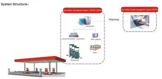 | Gas station management system(YS8100/8150) Remark:The support ability limit of this system: support as many as 9 tanks, 128 nozzles, 8 communication controllers and 1 tank gauge. | Ø (dispensers and tank)Status monitoringØ Price adjustmentØ Delivery registrationØ Shift processingØ Information inquiryØ Report management |