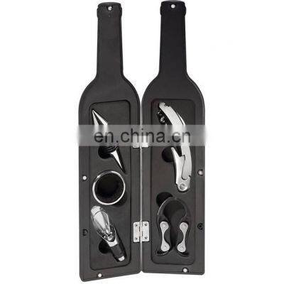 Related ProductsProduct DescriptionShaped like a wine bottle, the wine accessory set opens and shuts into place with its magnetic locking mechanism.5-piece set includes a stainless-steel corkscrew with foil cutting knife, drip-stop collar, combination wine pourer/stopper, and foil cutter.Stands vertically like a wine bottle or stores away into any wine rack.A fun and innovative to store and reveal your wine essentials.Wine Accessory Set makes opening a wine bottle easy, exciting and entertaining.Product TypeBar Bottle OpenerMaterialStainless Steel + Zinc AlloySize32 cm ColorBlackPackaging1 Set Per opp bag + White BoxLogoYesProduct DetailsMaterial : Stainless Steel + Zinc AlloySize 32 cmProduct ShowsCompany ProfileOur ServiceExpress Delivery by FedEx, DHL, TNT, UPS, EMS Shipment Weight1 - 45 kg45 - 200 kgor MoreMode of ShipmentBy CourierBy Courier / AirBy Air / SeaLead Time5 - 7 days5 - 7 days5 - 7 days30 days to Europe / USADoor to door delivery carrier includes: DHL, Fedex, UPS, TNT, EMS etc.A full range of sea and air logistics to provide you with the most convenientlogistics experience, rapid response to save your time.Payment TermsTrade AssurancePayPal / Secured PaymentWestern UnionBank TransferFor any amount< $ 5000For any amountFor any amountFrequently Asked QuestionsQ: Why choose us?• Lowest factory price with good quality• Low Minimum Order Quantity • Free sample to check quality• We also accept trade assurance order to protect buyerQ: What kind of method do you use to put customized logo?• Silk screen printing • Laser engraving • Etching• Stamping• Embossing / Debossing and any other mode you wantQ: How to save sample cost?• Stocked item, no MOQ. Small batch production also welcomedQ: How to get a sample?• We can supply free sample of standard product, you just need to bear the shipping cost.• For customized sample, please contact us for sample cost.Q: What is sample time and production?• Existing sample: 2-3 days• Customized sample: 7-10 days• Mass Production Time: 25-30 daysQ: What is your shipment term?• We can send your shipment by Sea / Air / Door to door courier, depends on the shipment size we can give you suggestions.• As we are sending shipments frequently by courier , we are getting good discount from the carrier, and we will transfer the benefit to you.Q: What is your term of payment?• We are quite flexible about payment, we accept T/T, PayPal, Western Union, Trade Assurance, etc.Contact DetailsPhone Number0086-512-68080479 (Ext No.602)Email Idsales@esunrix.comWhatsApp+86 13606131434Skypesunrise-sales3WeChatesunrix