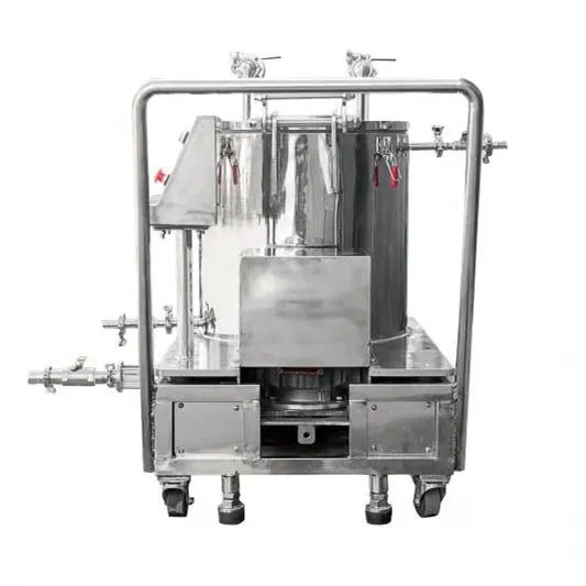1.5 Because the centrifuge has slight vibration during high-speed operation, the pipe (feeding pipe, outlet pipe, washing pipe,exhaust pipe, cable pipe, etc.) connected to the centrifuge must be flexibly connected, and the connection must be reliable.Sealed or insulated to ensure no leakage and safe use of electricity. The diameter of the external outlet pipe shall not be lessthan the diameter of the machine outlet pipe, and shall not have dead bends or blockages. The pipe arrangement shall be lower than the height of the outlet pipe outlet and have a certain height difference so that the liquid discharge is unblocked.Working principlesThe operator fills the filter bag with ground plant material and places it in the machine. Then, ethanol is added until the plant material is submerged, and the program is set to bidirectional (positive and reverse alternating) rotation to fully extract the active ingredients in the plant. The bottom valve is opened to release the extract, and then the plant material is subjected to high-speed rotary exhaustion of fluid to completely recover the extract.