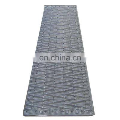 Customized KK 730mm*730mm*0.3mm PP PVC Cooling Tower Filling MediaCooling tower filling, also named as cooling tower fill media, or cooling tower fill pack, or cooling tower infill, or cooling tower filler, is made of PVC or PP plain plate, hot pressed in a certain mould and produced with different designs and sizes. Cooling tower fill is a very important component for water and gas exchanging in cooling towers. It is located in the middle or bottom of the cooling tower. Some cooling towers would be full of the fill media, some would have half and half of the fill media, and some large cooling towers would be installed 1 layer of the fill media in the bottom. The function of cooling tower filling is to increase the contact area between hot water and air and to extend the time of water flow, thus to help reduce the water temperature quickly. It is widely used in many kinds of cooling towers, especially industrial cooling tower, such as nuclear plant, energy and mining, big factory, thermal power factory, large steel mill, etc. Our cooling tower fill is with the feature of good chemical stability, anti-corrosion, high cooling efficiency, small ventilation resistance, strong hydrophilicity, large contact area, long service time, etc.NameCooling tower fill --- KKMaterial100% new PVCConditionNewProduction technologyMolding, cuttingLength730mm, 900mm, 1000mmWidth730mmThickness0.27mm ~ 0.4mmPitch19mm ~ 20mmDensity1.45ColorGraySampleAvailableCustomized or notYesCooling tower typeCross-flowSuitable cooling tower brandKK, JinRiHot water temperatureNot higher than 60℃StandardISOProduct FeatureOur cooling tower fill is with the feature of good chemical stability, anti-corrosion, high cooling efficiency, small ventilation resistance, strong hydrophilicity, large contact area, long service time, etc.Production ProcessOther modelsPackage and TransportationPackage: In bundle, or by pallet, or by wooden box, or as per customer's specific requirement. Delivery time: Usually the delivery time is within about 20 days after payment. Attention: When pack the cooling tower filling, please do not use airtight or air impermeable material, such as transparent plastic film or bubble plastic film, because that kind of packing material would keep the PVC fill in a very high temperature environment to make the PVC fill deform easily and affect its normal performace and usage.Why Choose Us?1. Highest qualityWe are the manufacturer who adopts imported raw materials to guarantee the high quality.2. Most competitive price We can adjust the price according to your market demand changes, and also can launch a series of promotional activities in a bad economic environment.3. Professional We have a complete team, including development, procurement, production, inspection, sales and after-sale service.4. Best service Trust, High quality and Best service build long term win-win business. We would give feedback within 24 hours. For any question or problem, we would try our best to help.FAQQ: How can you guarantee your product quality? A: 100% of our products would be tested before delivery. To control quality, we are using high quality material from high quality supplier.Q: Are you a trading company or a manufacturing factory?A:We are a manufacturing factory with export qualification. Our factory is one of the biggest FRP products manufacturer in China since 2011.Q: How about the Delivery time?A: 10-15 days after receiving the deposit based on the MOQ. Normally, 15 days to finish the order for a 20 ft container. Welcome to ask for the detailed delivery time according to your order quantity!We have been doing our best to provide products with the best quality and the most suitable price. If you are interested in our products, or if you have any question, welcome to contact us!