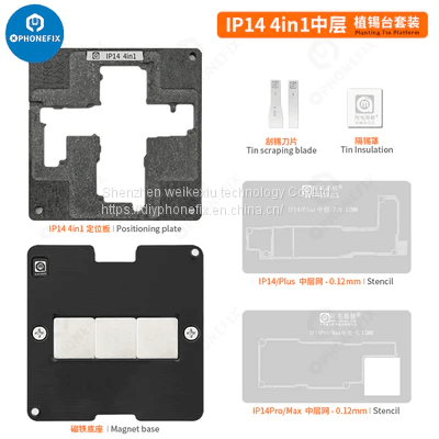 Amaoe iPhone 14 series 4 in 1 Motherboard Mid-Frame BGA Reballing Stencil Positioning Platform For iPhone 14/14 Plus/14 Pro/14 Pro Max Middle Layer Tin Planting Reballing Repair. Amaoe IP14 4-in-1 middle layer reballing platform for iPhone 14 series.
