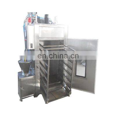 Automatic Meat Smoke machine Duck smoke machine +86-15237108185 1. it is suitable for smoking meat sausage fish duck and poultry aquatic products and other smoked products 2. Types:electric heating smoke house,baking smoke house,steam smoke house,refrigerating smoke house,heat conduction oil house 3. With low energy consumption,heating up fast , cooking,drying,baking,cold smoked,hot smoked,spray cooling and other functions 4. the key components is the steam pipes,heat exchanger(baking functionlity requires installation of electric pipe)and outlet channels . The mixture of hot air and the fume inside become vortext region under the effect of two groups of circle fans ,so that the mixture gas through the meat hanging in the smoke box enevtly in appropriate rate to curing and sterilization5. ModelCapacity(kg)Working pressure(Mpa)Machine size (mm)Power(kw)Weight(kg)HX-30L300.1~0.21070*900*13103.5350HX-50L500.1~0.21200*1000*16803.5500HX-100L1000.1~0.21350*1200*18004800HX-150L150-1800.1~0.21350*1200*25004.51000HX-200L200-2200.1~0.21350*1250*270061200HX-250L250-3000.1~0.21600*1350*30007.51900FX-500L500-5500.1~0.22500*1550*3000132600HX-1000L1000-12000.1~0.24490*1550*3000244000 Here is medium model, capacity 150kg/batch