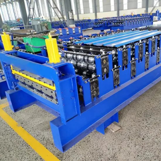 10. Technique parameters of the main roll forming machine (1). Forming stations: corrugated 13 / IBR 18; (2). Roller material: 45# steel with CNC machining and surface is being hard chrome; (3). Diameter of shaft: ยข70mm solid forged 45 #steel, quenching process; (4). Material of shaft: solid 45# steel with grinding process; (5). Frame of the machine: welded with 350H section steel; (6). Wall panel thickness: 16mm; (7). Forming motor power: 4KW; (8). Hydraulic station motor power: 4KW; (9). Control system: PLC brand is DELTA from Taiwan; (10). Material of cutting blade: Cr12MoV with hard treatment, HRC52-68; (11). Driving mode: single chain 1 inch; (12). Forming speed: 0-15m/min; (13). Power supply: 380V, 50HZ, 3 PHASES; (14). Dimensions of forming machine: 8500mm*1100mm*1200mm (approximate). |