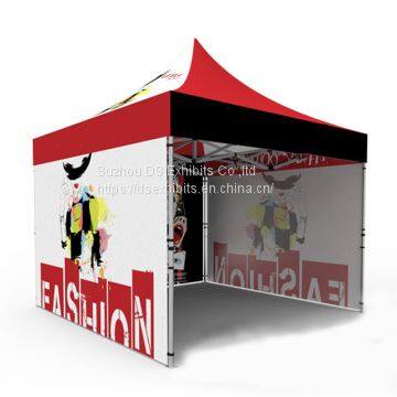 The tent top is printed and sewn 420D, 300D, 600D PU coated Polyester. Our dye sublimation printed tent can ensure you clear and bright color. If you want to be unique among the trade show booth, you definitely need a custom advertising tent.