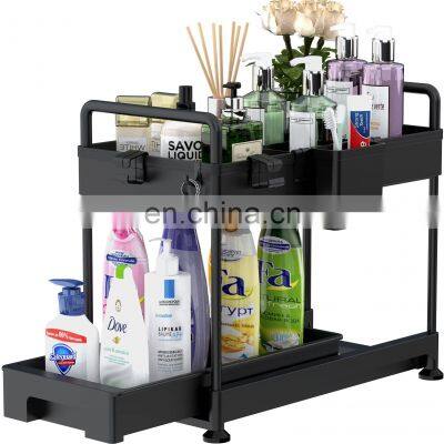 Recommend ProductsContact Info.Products DescriptionProduct NamePull Out Under Sink Cabinet Organizer, 2-Tier Sliding Storage Drawer Basket Organizer for Kitchen Bathroom, with Hooks, HangingCup, Dividers, Multi-purpose Under Sink Shelf Organizer, BlackItem NumberAM015Place of OriginJiangmen CityColorBlackMaterialPlasticProduct25.6"D x 8.6"W x 13.8"HWeight3.15 pounds(1.43 kg)Product packagingWhy Choose UsOur PartnersFAQQ1: Are you manufacturer?A1: We are both Manufacturer and Trade company. You can get the best service and the best price from us.Q2: What is your MOQ? Is a small order OK?A2: Our MOQ is flexible. You can order as much as you want. Follow your need.Q3: How about the samples?A3: We can arrange the samples to you if you need it.Q4: OEM or ODM is available?A4: Yes. We provide both OEM & ODM.Q5: Can I print the LOGO on the carton box?A5: Sure. We will send the design document of carton box to you for customization. The MOQ of the customized carton box is 200.Q6: How long is the delivery time usually?A6: We usually have enough stock. Within 200 pieces can be shipped within 1-3 days.Q7: How about the shipping cost?A7: The size and weight of each product are different, so you can contact us at any time to help you calculate the shipping cost.