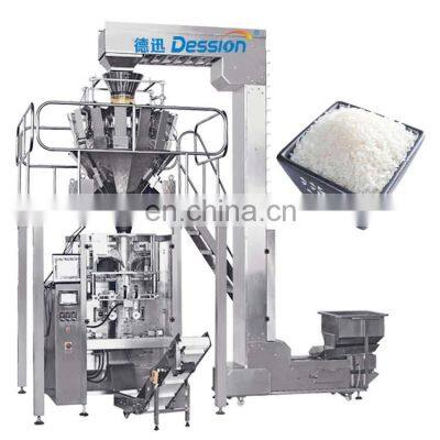 Automatic 500g 1Kg 2Kg 3Kg Rice Packing MachineDession automatic weighing packing machine is suitable for packaging of bulk materials with high precision and fragility, such as: puffed food, jelly, candy, nuts, potato chips, small hardware, medicinal materials, etc.According to customer needs,can offer different bag styles.such as pillow bag,back sealed bag with hole,gusseted bag and gusseted bag with hole hanging.Products Description1. The section where the material contact is stainless steel as the body of machine is optional for complete or partial stainless steel and all out equipments have passed the CE Standard. 2. Optional English or Chinese screen display, easy and simple operation. 3.High-sensitivity photoelectric color tracing and digital input of cutting position get more accuracy.4. Packaging speed and length of bags can be set to some extent without further adjustment and parts changing. Packaging speed and length of bags can be set to some extent without further adjustment and parts changing. 5. Bag-making, filling, sealing,cutting, counting, thermal pressing of batch number can be achieved automatically and straightly. 6. Flat cutting, pattern cutting, linking cutting can be realized by changing the tools;easy operation with smooth bags. 7. Bag-making equipment can be changed according to specific requirement of customers and products.ModelDS-420AZMeasuring Range150-1500mlPackaging Speed5-60 bags/minBag Width60-200mmBag Length80-300mmFilm Roll WidthMax.420mmPower220V, 50/60HZ, 2.2KVAOptional DeviceDate Coder / Air-filling Device / Punching DeviceMachine Size(L)5124*(W)1820*(H)3518.5mmMachine Weight650KGEasy Control Touch ScreenLanguage: Standard English and Chinese. Any language can be customized.PLC: Imported PLC microcomputer with interface and frequency control enables bag parameter setting more convenient and easier. Film RollerThe film can be replaced easily on the film roller.Various films adaptable: OPP/CPP,OPP/CE,MST/PE/PET/PE.Multi-head scale#304 stainless steel measurement parts will measure the weight of each bag automatically.Bag Former#304 stainless steel bag former is for shaping the film into a bag.Different bag width needs different bag former.Durable Sealing Cutting BladesHigh speed of fine and clean cutting and sealing bags.Positioned stop function avoides sticking blades and wasting materials.According to customer needs,the bag types can be changed:back seal,stand-up bag and linking bag.4 Head Electronic Scale14 Head Electronic ScaleRecommend ProductsOur CompanyCertificationsPacking & DeliveryPayment1.T/T and Western Union are accepted2.30% deposit before production and 70% balance before shipment3.All banking charges outside China are on buyersShipping1.Upon receipt of payment , delivery date will be in 15-30 working days,2.By Air, by Sea or by Express (DHL etc)3.Shipment cost will depend on the destination, shipment way and the weight of the goodsFAQQ1:Do you have manual or operation video for us to know more about the machine? Yes, not only manual or operation video, 3D drawing also available to make as per your design,also the video we can make of testing the material from our packaging machine if your packing goods easier for us to find from our local market. Q2:How can I trust you for the first time business ?Please note our above business license and certificate. And if you don't trust us, then we can use Alibaba trade assurance service, guarantee your money, and guarantee your machine's on-time delivery and machine quality.Q3:Is engineer available to serve oversea?Yes, but the travel fee is paid by you. So actually to save your cost, we will send you a video of full details machine installation and assist you till the end.Q4:How can we make sure about the machine quality after we put the order?Before delivery, we will send you the pictures and videos for you to check the quality, and also you can arrange for quality checking by yourself or by your contacts in China.Q5:Will you provides the door to door service?Yes. Please offer us your final destination, we will check with our agent to see if it available, and most of the area is ok for us to clearing and sending in your countries.Why Choose Us
