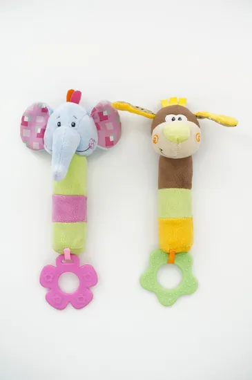Introducing our Adorable Animal Shake & Teethe Toys, perfect for importers and wholesale distributors! These charming toys come in two delightful animal designs - an elephant with a pink nose and blue body, and a dog with yellow and brown stripes. Both animals feature black eyes that make them look even more lovable. The main attraction of these toys is their internal BB sounder that makes a delightful noise when shaken, captivating kids' attention. Below each toy hangs a teething ring made of soft, durable material that babies can gnaw on to satisfy their oral fixation. This teething ring also helps soothe and calm fussy babies. Crafted with a cylinder shaped body, these toys are designed to enhance babies' hand-eye coordination and grip strength. Our superior craftsmanship ensures that these toys are sturdy and tear-resistant, maintaining their shape and function over time. Place these toys on your shelves or online storefront, and watch as they quickly become a favorite among young children. Order now and bring joy and developmental benefits to babies with our Adorable Animal Shake & Teethe Toys! Exhibition Photos