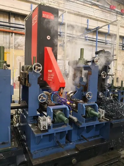 Uncoiler→ Shear&welding machine→ Accumulator (Cage) →Forming machine→ HF welding→ Sizing machine→ Flying saw (Cold saw) → Run out table→hydro testing→end facing