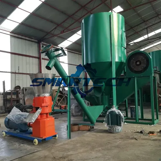 The feed production line is an iconic marvel of modern engineering, featuring a state-of-the-art Stock bin, a powerful Grinder, a Temporary storage bin, a precise Mixer, a Finished product bin, an efficient Granulator, a Cooling machine, a Packaging machine, and more. This symphony of machinery flawlessly integrates indispensable processes like crushing, mixing, and meticulous electrical control. Unleash the power of high crushing efficiency, enjoying a stable, reliable operation through its ingeniously compact structure, designed for effortless installation and seamless operation. Our revolutionary crusher amplifies raw material crushing efficiency, exponentially boosting output. The cleverly designed cache compartment ingeniously prevents motor burnout from excessive feeding rates, and the high-speed spiral elevator ensures swift material transport, maximizing productivity to new heights.Discover unparalleled mixing precision with our Horizontal mixer, masterfully engineered to refine and enhance raw material blending. This adaptable machine is customizable to perfectly align with your specific production needs, offering tailor-made specifications and sizes that make it an exceptional choice for feed processing in breeding farms. Elevate your feed processing prowess and guarantee top-notch quality with our innovative solutions.