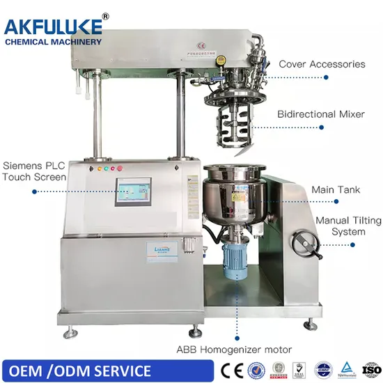 It means that when the materials are under the vacuum condition, it makes use of the high shear emulsifier to distribute one or several phases to another continuous phase rapidly and evenly.