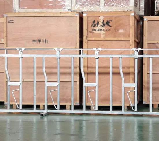 Main components and materials: Upper and lower crossbar:40*50*2.75,Q235 Straight support rod:Ф42*2.75,Q235. Bending support rod:Ф42*2.75,special equipment processed:inner arc has no ripples, and the outer arc has no scratches. Moveable rod:Ф42*2.75,Q235. Supports for moveable rod:stamping, 4.25mm thick,Q235 After welding completed, all the above main components will be overall galvanized , and the galvanized layer more than 80um. Self locking system: the dovetail clip is stamped by 4mm integral galvanized Q235 steel plate, Transmission pipe of self locking system: Q235 galvanized tube,Ф25*2.5. 6m/piece/ 9 cow position, every 3m fastened by special clamps with reinforced columns Product Parameters