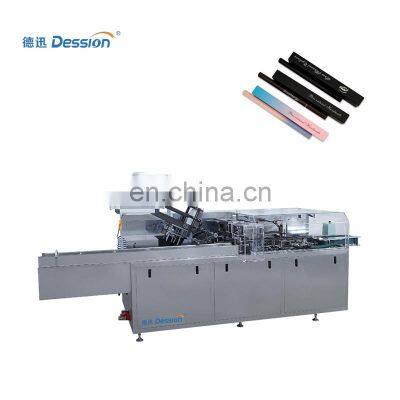 High Speed Eyebrow Pencil Packing Machine Eyebrow Pencil Cartoning MachineDession engaged in exported various filling and packing machine all over the world. Our machine widely applied for various kinds of regular objects like food, medicine, daily appliances,cosmetic,metals, industrial parts, boxes, trays, toys and etc.Box HolderBox Opening DeviceBox Sealing DeviceTouch ScreenModelDS-100APackaging Speed30-80boxes /minBox Quality Requirement250-350g/ m2 (according to customers' request)Box Dimension Range(65-200)mm* (30-90)mm* (15-60)mm (can be customized)Working pressure>=0.6mpaPower380V 50HZAir Consumption20m3/hMachine Size(L)3800*(W)1100*(H)1900mmMachine characteristics:1.Efficient: Box-filling, sealing, heating, date / lot number achieved in one time.2.Intelligent: Packing speed can be set through the screen without part changes.3.Profession: Dual inverters controller, upgradable PLC system, self-failure diagnosis, double encoder. 4.Characteristic: Automatic electronic eye detect to avoid empty box.5.Convenient: Low loss, labor saving, easy for operation and maintenance.6.Adapability: one set of machine can be applicated to different kind of product.Payment1.T/T and Western Union are accepted2.30% deposit before production and 70% balance before shipment3.All banking charges outside China are on buyersShipping1.Upon receipt of payment , delivery date will be in 15-30 working days,2.By Air, by Sea or by Express (DHL etc)3.Shipment cost will depend on the destination, shipment way and the weight of the goods