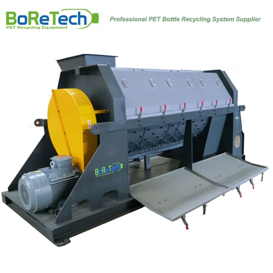 In Asia, most of labels made from PVC heat-shrinkage film which cannot be removed through bottle prewashing; this is another major problem in PET recycling industry. BoReTech patented label separation machine completely solved this problem. Firstly, label scrapper will tear the labels, so that the labels no longer attached to bottles, and then,the labels will completely separated by adjustable wind-force and gravity difference.