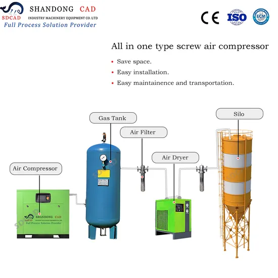 SDCAD air compressor is a special low-pressure screw air compressor developed entirely for mixing stations. It adopts a fully sealed structure and is waterproof and can be placed directly outdoors without a special machine room. The ultra-large rotor design ensures low-speed operation of the main engine while providing large air volume. All bearings are made of German special bearings to ensure long-term stable and reliable operation of the main engine. The system adds an independent forced lubricating oil pump design to ensure cooling and forced lubrication of various moving parts under low-pressure conditions.