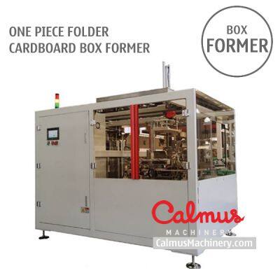 This one piece folder box former picks one-piece folder cardboards from the storage tray, delivers them to be shaped with a punch in a cave, folds and seals edges with hot melt glue.