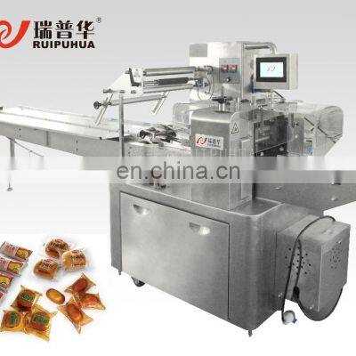 Bakery Food, Bread, Cake, Biscuit, Horizontal Flowpack Packaging Machine Packing Line ApplicationsSuitable for packing bakery products, such as layer cake, Swiss roll, cookies, biscuits, dates, maamoul, muffin, cup cake. It also suitable for daily items, hardwares, tools and other regular shape objects. Bag types*pillow bag*pillow bag with hole punch*pillow bag with euro slot*gusseted bag *continous bag Packing Samples Technical Parameter (1) Menu storage and memory functionThe controller can save a variety of parameter configurations, and the recipe can be used when the product or packaging film is replaced by calling out the formula on the touch screen. (2) Bag length unlimited The industry-leading electronic cam algorithm, the bag length range is from 60mm to unlimited length, the bag length is set and cut immediately in one step, saving time and film. (3) Nitrogen filling function (4) No product, no bag function/ Anti-cutting functionAdvanced electronic anti-cutting, electronic anti-empty bag algorithm. The empty material film stops, saving packaging materials. (5) 3-Servo motor/PLC controlThe horizontal seal is controlled by an independent servo motor, and the longitudinal seal and the feeding tailstock are controlled by a frequency conversion motor. The mechanical structure is simple, the operation is stable, and the noise is low. (6)High precisionThe feeding speed is automatically tracked, and the packaging machine automatically accelerates and decelerates. High speed, higher precision, double knife speed can reach 300 packs/min, error ±1mm. (7) Man-machine interface, convenient and quick parameter setting, automatic tracking of color code, automatic correction of cutting length. Digitally input the sealing and cutting position to make the sealing and cutting position more accurate. (8) The fault is automatically diagnosed, and the fault display is clear at a glance. (9) Well-known brand servo motor/controller/touch screen, vertical sealing/discharging belt brush. (10) Optional configuration: coding machine, double support paper, automatic film connection, inflation, spray alcohol, lifting panel, stainless steel machine body. Packing machine parametersModelZP500SG(3 servo) double blade)ZP500SG(3 servo) single blade)Packing speed35-300bags/min35-200bags/minBag size(L)60mm-infinite,(W)30-150mm,(H)5-50mm(L)80mm-infinite,(W)30-150mm,(H)5-55mmFilm width65-400mmPacking materialOPP/CPP,PT/PE,KOP/CPP,ALU-FOILMachine dimension(L)4000X(W)900X(H)1600mmHeating power3.8kw2.4kwMotor power2.5kwTotal power6.3kw4.9kwMachine weight630kg Product Certification Machine detail Company scene Why choose us? 1)Why should you choose Ruipuhua(Rapid) Packaging machinery ?Ruipuhua(Rapid) is specializing in packing machine for more than 10 years,with good quality and competitive price. 2)Can you provide after-sale service?Of course,we have engineers available to service machinery overseas . 3)Can I visit your factory and send workers for learning ?Yes,we will provide you with training for the workers. 4)What is Our Advantages?1. Provide customized services for special requirement;2. Competitive price and reliable quality;3. Professional inspection department to guarantee quality. 5)How to Contact Us?Send your Inquiry Details in the Below, Click "Send" Now!