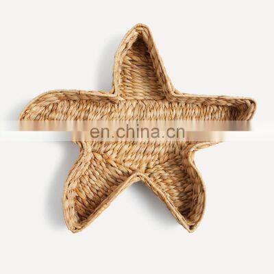 Product DescriptionUnique Star Shaped Water Hyacinth Tray basket Boho woven serving tray Wicker basket set Cheap WholesaleDue to the natural appearance of the water hyacinth, these baskets are suitable for creating a particularly warm indoor climate, suitable for the Nordic style.Basket trays are particularly suitable as containers on the dining table. As a bowl in daily life, it can also be used as a serving bowl on the table. You can put tableware, fruit or candy. Natural materials have a natural protective effect and can be easily wiped clean. It is very suitable for daily use as a kitchen storage room or a bread basket in a restaurant.Plant Fiber TypeWater HyacinthTypeStorage TraysApplicable SpaceBathroom, Living Room, KitchenTechnicswovenProductFood containerShapeStarCommercial BuyerRestaurants, Food & Beverage Stores, Super Markets, Hotels, Gifts StoresSeasonEverydayRelated ProductRecommended By SellerMain MaterialMain MarketsPacking & DeliveryOur Selling PointsCompany Profile