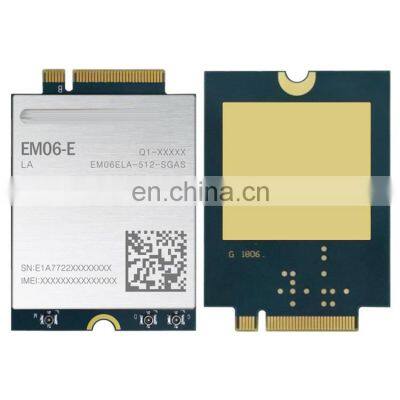 DescriptionOverviewEM06 is a series of LTE Advanced category 6 module optimized specially for M2M and IoT applications. Adopting the 3GPP Rel. 11 LTE technology, it delivers maximum data rates up to 300Mbps downlink and 50Mbps uplink.Designed in the M.2 form factor, EM06 contains 3 variants (EM06-E, EM06-J and EM06-A) for different target regions and these variants nearly cover all the main stream carriers worldwide.EM06 supports Qualcomm® IZat™ location technology Gen8C Lite (GPS, GLONASS, BeiDou/Compass, Galileo and QZSS). The integrated GNSS greatly simplifies product design, and provides quicker, more accurate and more dependable positioning capability.A rich set of Internet protocols, industry-standard interfaces and abundant functionalities (USB drivers for Windows 7/8/8.1/10, Linux, Android) extend the applicability of the module to a wide range of M2M and IoT applications such as industrial router, home gateway, set top box, industrial laptop, consumer laptop, industrial PDA, rugged tablet PC, video surveillance and digital signage, etc.Key Benefits● LTE-A Cat 6 module with M.2 form factor, optimized for M2M and IoT applications● Support LTE-A carrier aggregation● Worldwide LTE-A and UMTS/HSPA(+) coverage● Multi-constellation GNSS receiver available for applications requiring fast and accurate fixes in any environment● Feature refinements: supports DFOTA and DTMF● MIMO technology meets demands for data rate and link reliability in modem wireless communication systemsWhy Choose UsFAQQ1. What is the minimum order quantity for your products?A1. Minimum order quantity starts from ONE piece.Q2. What's the quality of your products?A2. We have professional QA/QC team to ensure the quality before shipment. We provide 1 year warranty for all the new and original products.Q3. Is this product free of shipping or free samples?A3. Regularly the sample and shipping cost will be at the buyer's account. But in specific case, we may take these costs. Please kindly check with us the details by email. Thank you.All Categories4G 5G ModuleGPS ReceiverGPS AntennaGSM/LTE/WiFi AntennaGSM/LTE+GPS AntennaGNSS/GPS Module2G/3G/4G ModemGPS TrackerRF Coaxial / ConnectorSIMCard HolderSensorIC