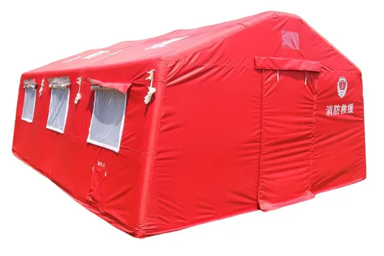 square Product Description Structure The inflatable tent features a double-slope structure, with windows on both sides and a door on the gable wall. The overall tent consists of an outer cover, inner cover, ground cloth, air columns, ground pegs, and a hammer. 2. Dimensions 2.1 Our company's inflatable disaster relief tents can be customized according to customer requirements, ranging from 9 square meters to 56 square meters. 2.2 Dimensions: Length × Width × Height × Ridge Height (5420 × 3450 × 1900 × 2550 mm) 3. Main Uses Primarily used for outdoor camping. 4. Materials Outer cover material: Sky blue polyester coated Oxford cloth. Inner cover material: 190T polyester silk. Ground cloth material: Double-sided PVC coated fabric (400 g/square ± 20 g/square). Product Parameters