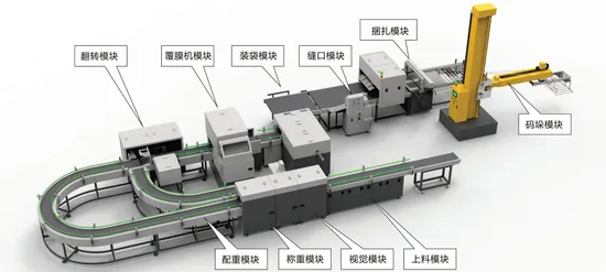 1. Feeding unit 2. Visual unit 3. Weighing unit 4. Counterweight unit 5. Overturn unit 6. Laminator unit 7. Bagging unit 8. Seam unit 9. Tying unit 10. Palletizing unit