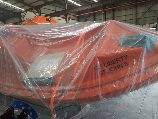 Material of this rescue boat: The hull is constructed by hand lay-up with G.R.P material. The hull and the inner hull are separately laminated. The space between the hull and the inner hull is filled with Polyurethane foam as buoyancy.