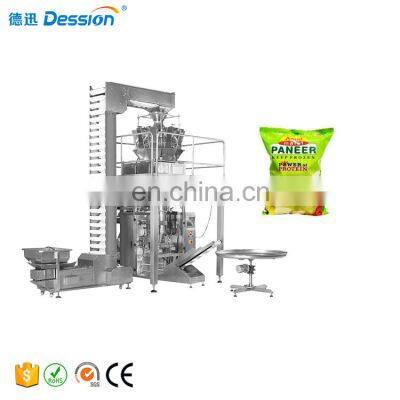 Paneer automatic pouch packaging filling machine priceMachine IntroductionPackaging ApplicationThis machine is suitable for packing of bulk materials with high precision and fragility.Such as puffed food, casserole, candy, potato chips, nuts, frozen food, pet food, small hardware, medicinal materials, etc.Packing EffectThis machine can provide back-seal packing.It can be upgraded to add the bag with hanging holes, bag with easy tear, gusseted bag and quad sealed bag effect according to the needsMachine Structure and ParametersModelDS-320AZDS-420AZDS-520AZDS-620AZDS-720AZFilm WidthMax.320mmMax.420mmMax.520mmMax.620mmMax.720mmFilling range150~800ml150~1500ml150~2000ml150~4000ml150~400mlBag sizeL:80~240mmW:50~150mmL:80~300mmW:60~200mmL:80~350mmW:80~250mmL:150~350mmW:200~350mmL:100~450mmW:100~350mmPacking speed5~70bags/min5~60bags/min10~50bags/min5~50bags/min10~40bags/minOptional deviceAngle of plug-in device, Linking bags device, Gas-filling device, Punching deviceMachine Characteristic1)Imported PLC full computer control system, color touch screen, easy to operate, intuitive and efficient.2)Impoted servo film transport system, imported color code sensor, accurate positioning, excellent overall performance and beautiful packaging.3)A variety of automatic alarm protection functions to minimize losser.4)Flat cutting, pattern cutting, linking cutting can be realized by changing the tools;easy operation with smooth bags.5)Bag-making equipment can be changed according to specific requirement of customers and products.6)Optional English or other languages screen display, easy and simple operation. Both packaging speed and bag length can be set with one click.7)All machines have CE certification and ROSH certificate.Details ImagesMachine WorkflowThis machine is easy to operate. Just set the parameters on the screen, and then you can start the machine. Put the product in the hopper, the machine will automatically pull the film, the bag is formed, sealed, and finally the bag is cut.Easy Control Touch ScreenLanguage: Standard English and Chinese. Any language can be customized.PLC: Imported PLC microcomputer with interface and frequency control enables bag parameter setting more convenient and easier.Automatic Electronic WeighterHigh precision sensor, Making high accuracy measuring; With excellent compatibility and easy using with other parts of packingequipment. Bag Former#304 stainless steel bag former is for shaping the film into a bag.Different bag width needs different bag former.Sealing and Cutting DeviceThe wheels will pull the film to this cutting device, which will create the top and bottom of the bags.Related ProductsWhy Choose UsVR1. Professional and Strong TeamDession has a professional team that can provide customers with various packaging solutions. After fully understanding the customer's needs, we provide the most suitable packaging solution to the customer. Then start the production of the machine. We have a strong production and processing capacity, from the customized processing of accessories to the assembly and debugging ofthe machine. Finally, it is packaged and shipped, and it only takes a week to complete.2. Excellent transportation serviceAccording to the needs of customers, we can provide sea transportation, air transportation, and land transportation services, so that you can get the machine as soon as possible. Provide door-to-door transportation services.3. Timely and effective after-sales serviceChoosing us is not only buying a machine, but also our professional and timely service. 1. When the machine is delivered, we will attach a video of the installation and operation of the machine, so that you can use the machine quickly. 2. All electrical appliances of our machines have a one-year warranty, and we will replace them if they fail. 3. When your machine fails, we will have professional engineers to provide professional online after-sales service to help you solve the problem. 4. If the problem cannot be solved online, we will arrange an engineer to repair it on site within a week.Buyer FeedbackWe have 8 years of experience in foreign trade and export, and now our customers have spread to 90 countries all over the world. With our high-quality machines and professional services, we have won unanimous praise from our customers.Company ProfileDession a leading manufacturer of Packaging machine and supporting facilities, which has successfully developed more than 80 kinds of packaging machines. Dession Packaging Machine has widely applied for different fields throughout the world, such as food/ industrial food, medicines, hotel supplies, disposable goods, rubber goods, daily appliances, hardware fittings, sporting goods, toys etc. Dession has more than 8000 square meters of production plants, 5 production workshops and a parts processing workshop, including small vertical machine production workshops, vertical machine production workshops, pillow machine production workshops, cartoning machine production workshop and filling machine production workshop.FAQQ1:Do you have manual or operation video for us to know more about the machine? Yes, not only manual or operation video, 3D drawing also available to make as per your design,also the video we can make of testing the material from our packaging machine if your packing goods easier for us to find from our local market. Q2:How can I trust you for the first time business ?Please note our above business license and certificate. And if you don't trust us, then we can use Alibaba trade assurance service, guarantee your money, and guarantee your machine's on-time delivery and machine quality.Q3:Is engineer available to serve oversea?Yes, but the travel fee is paid by you. So actually to save your cost, we will send you a video of full details machine installation and assist you till the end.Q4:How can we make sure about the machine quality after we put the order?Before delivery, we will send you the pictures and videos for you to 