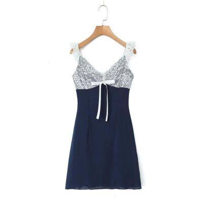 European and American foreign trade summer retro y2k hot girl pure lust style lace stitching bow short strap dress