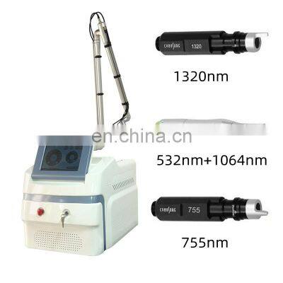 Portable painless nd yag picolaser tattoo removal carbon peeling machineProduct DescriptionWorking PrincipleThe PicoSecond Laser uses ultrashort pulses (one trillionth of a second in length) to hit melanin with enormous pressure, which shatters into tiny dust-like particles. For quick and easy non-surgical, non-invasive laser skin treatment on the body (including the chest) Quick and easy non-surgical, non-invasive laser skin treatment on the body (including the chest or shoulders, face, hands, legs, etc.).High-voltage pulsed xenon lamps and YAG crystal rods can be generated when the laser is used in the laser cavity. When the laser xenon lamp injects a certain amount of energy into the xenon lamp, the YAG ingot is excited to emit 755/1064/532 nm laser, and the polarizer is unified to the same direction for the emitted laser, so that the single output laser is better. After the laser enters the laser cavity, in front of the mirror, the mirror surface of the laser resonant part triggers the Q crystal for a short time, and then emits the laser again and passes through the 45-degree mirror reflector lamp arm twice. The laser xenon lamp will generate a lot of heat during the irradiation process; it will heat up when it passes through the water circulation system.1064nm: Removal of freckles and tan spots, eyebrow tattoos, failed eyeliner tattoos, tattoos, birthmarks and moles of Ota,Pigmentation and age spots, black and blue moles, scarlet, dark coffee and more.755nm:Suitable for treatment of red or tan, green and other color tattoos, eyebrows, lip liner, eyeliner. Effectively fades red or tan birthmarks and all types of light spots532nm: Remove freckles, eyebrow tattoos, failed eyeliner tattoos, eyebrow tattoos, lip liner, pigment, light red, brown, pink and other light-colored telangiectasia1320nm: Shrink pores, remove blackheads, firming and whitening, skin rejuvenation, wrinkle reductionAdvantages1). High techThe picosecond laser machine uses a unique honeycomb focusing technology to form skin-effect vacuoles, which protect the skin from damage during the treatment process.2).Quick and effectiveThe picosecond laser machine reduces the tattoo and pigment removal treatment process from 5 to 10 to 2 to 4, greatly shortens the treatment and recovery time, and is fast and obvious.3). Comfort and safetyIt can effectively and safely remove all kinds of pigments and tattoos, because the picosecond laser can reduce the damage to the skin and achieve the effect of freckle removal by accurately positioning the target tissue for treatment.4).No precipitation of melaninThe picosecond laser utilizes ultra-short pulses (one trillionth of a second in length) to hit melanin with enormous pressure, and the melanin is crushed into tiny dust-like particles, which are more easily absorbed and eliminated due to their small size, which can significantly reduce postoperative Swelling and melanin precipitation.Function1. Depigmentation of the epidermis: body tattoos, eyeliner and eyebrow tattoos.2. Dermal pigments: Ota nevus, birthmarks, café-au-lait spots, age spots, freckles.3. Vascular diseases: varicose veins, capillary hemangioma.4. Laser Facial: Oil control, skin rejuvenation, and skin pores improvement.TechnologyItem namePortable Picosecond Laser Tattoo removal MachineFrequency1-10HZ(adjustable)Pulse Width 6-8nsSpot size1-10mm adjustablePower2000WWavelength755nm,1064nm,532nm,1320nmEnergy2000mjScreen8 inch intelligent colorful touch screenVoltageAC 220V±10%,50HZ;110V±10%,60HZ;ApplicationTattoo removal,Eyebrow tattoo removal,Pigment removal,Birthmark removal,Carbon laser skin rejuvenation and so onAccessoriesPackaging & ShippingCompany InformationOur ServicesTraining: User manual and operation video are provided. Support online face to face training.Warranty: Three years warranty on host machine is given. Six months free replacement warranty for handles, treatment heads, and parts. After-Sale: We have a professional technology supporting team for your timely services. You can get the help you need in time by telephone, webcam, online chat (Google talk, Facebook, Skype). Please contact us once the machine has any problem. Best service will be offered. OEM/ODM: We can offer you better OEM and ODM services. We have our own R&D department with many experienced designers and engineers and many production lines , so we have the great capacity to offer you high quality beauty machines according to your needs, ideas and samples.Package: There’re different packages of our beauty equipments:carton box,aluminium alloy and wooden box.No matter which package,there’s cood foam inside of the box to protect the machine during the shipment.So there’s no worry of any damages of the machine.Shipment: Deliver the machine within 3-7 working days by air door to door service.Contact Us