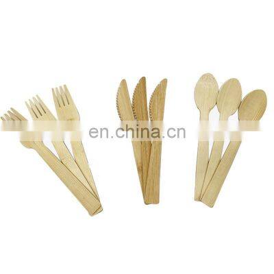 SpecificationProduct NameBamboo Cutlery(Spoon, knife, fork)Material100% natural bamboo (over 3 years old)ColorNatural/CarbonizedSizeLength: 170mmPackage1. 500pcs/bag2. Personified design and LOGO are workable.Product Description The customized logo and package is available!!!Recommend ProductsCompany ProfileCertificationsFAQ 1 Q: Do you manufacture the products independently? A: Yes, welcome to visiting our factory. ------------------------------------------------------------------------------------- 2 Q: Do you have competitive price than other supplier? A: Absolutely. The same product we will do the best price, the same price we will do our best quality. ------------------------------------------------------------------------------------- 3 Q: How about the shipment? A: We will ship the goods within 25-30 days after received the payment. ------------------------------------------------------------------------------------- 4 Q: How many styles about your disposable chopsticks? A: There are 5 main types chopsticks:Twins((Sousei), Tensoge, Round, Genroku(Yuanlu), Rikyu. --------------------------------------------------------------- 5 Q: Can I do my own designed package? A: Sure, the customized logo and package is available. --------------------------------------------------------------- 6 Q: What certificates can you offer? A: We can offer CIQ, SGS, ISO certificates for you reference. ---------------------------------------------------------------Contact