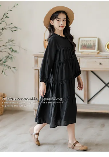 This girl's black dress features a casual style. It has long - sleeved design with lantern - shaped cuffs. The dress body is decorated with multiple pleats, creating a sense of hierarchy. The overall shape is simple and elegant. Made of skin - friendly fabric, it is suitable for daily wear.