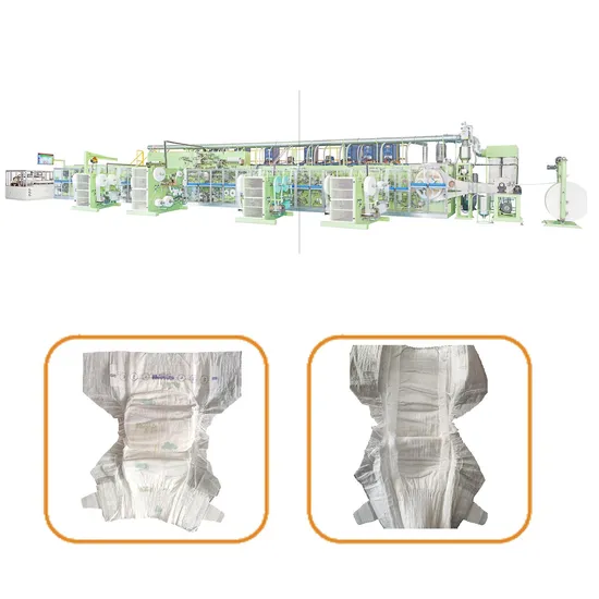 The full servo big waist baby diaper making machine adopts servo motor driven,human-computer interface, easy and fast operation, the product model only needs to be adjusted on the touch screen, the amount of cotton paste applied, the amount of polymer applied, and the splicing speed can be set respectively on the operating screen,) raw materials lacking, jointer, splice, fans & vacuum pump jump-off, all display the real-time information and production speed(pcs\min), shift output, rejecting quantity, total capacity, are interface display. The servo drive system can adjust the speed and force of the production line according to the requirements of the product, thus ensuring the quality and stability of the product. The human-machine interface can be manipulated and has many features beyond those listed above. It is used in the manufacture of high-quality baby diapers. The raw materials used in the production of baby diapers are cotton core (mixed with SAP), ADL, PE film, Frontal tape, Topsheet hydrophilic nonwoven, Leg cuff hydrophobic nonwoven, etc.