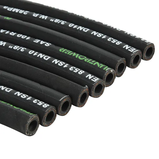 | 1. Application: Medium pressure hydraulic applications including mobile, machine tool and agricultural applications, using petroleum or water-based hydraulic fluids. 2. Process feature: Refrigeration technique 3. Inner tube: Nitrile 4. Reinforcement: One or Two braids of high-tensile steel wire 5. Cover compound: Neoprene 6. Temperature range: -40°F 212°F; -40ºC~121ºC 7. Color available: Black, grey, blue, yellow, red, etc 8. Surface: Smooth and cloth |