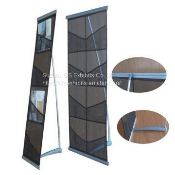This is a catalogue holder with 4 brochure pockets.It is made of netting (mesh material),iron foot and fibre pole. Black pocket with black foot,grey pocket with grey foot is better for your choice.