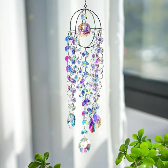 About this itemDesign - This chandelier wind chime is made of high quality K9 grade ab color coating crystal glass suncatcher prisms and beads chain and silver plated metal suncatcher frameSuncatcher - This crystal wind chimes makes great light catcher and rainbow maker when in direct sunlight, it'll be sparkling and cast beautiful rainbows all over your room through sunlight hitDecoration - Length: 21inches. This hanging crystal prism suncatcher makes beautiful addition to your window,garden,doorway,backyard pergolaGift - This hanging crystal suncatcher chandelier makes great crystal gift for those pursuing elegance and beauty in life on most occasions like birthday,Valentine's Day,Mother's Day,Thanksgiving,ChristmasService - If any quality issue or defective items received,pls contact us,free replacement or full refund will be followed accordingly