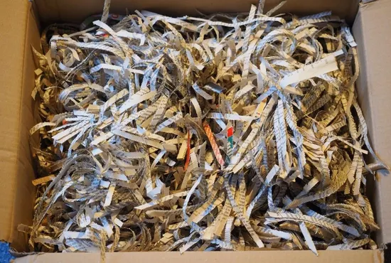 Industrial Large-scale shredder for paper, staples, paper clips, credit/store cards, CDs/DVDs, floppy disks, and USB sticks.