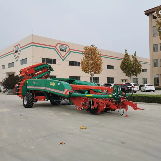 4ULZ-170 potato combine harvester can directly load potatoes into the truck, simplifying the work flow and reducing the labor intensity. The structure type is traction type. During work, the tractor pulls the combine harvester and excavates the digging shovel. At the same time, the potato-soil loosening and excavation depth limit are carried out by the contour-shaped deep-wheel, and the excavated potato soil is transported through the conveying net sieve for potato-soil separation and potato block transportation. In the process of potato tuber transport, the potato is separated, the clean potato after the potato-soil, potato-salt separation enters the potato transport device, and finally the clean potato is transported to the transport vehicle through the potato transport device, and the transport vehicle after the harvest is transported away.