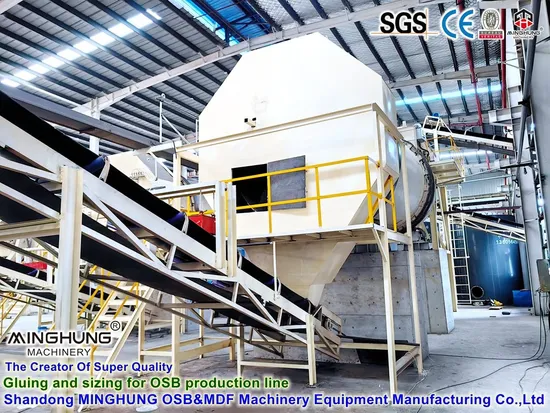 | Preparing Stage: 1. DEBARKER:The logs typically retain outer bark and irregular surface layers. By using a debarker to remove the bark and irregularities from the surface of the logs, it enhances the efficiency and quality of subsequent processing. 2. CHIPPER&FLAKING: Used to chip wood into wood chips, usually using rotating cutting tools to chip wood into wood chips of a certain size. 3. DRYER: Remove moisture from wood chips or timber to ensure that the wood reaches the appropriate humidity and moisture content for subsequent mixing, forming, and hot pressing processes | Mixing&Forming Stage: 4. GLUE MIXER: Equipment used to mix wood chips with adhesive and other additives uniformly, ensuring that the mixture has a certain uniformity and moisture content. 5. FORMING: Used to press the mixed wood chips and adhesive into a board shape, usually using continuous or batch forming machines for molding. |
