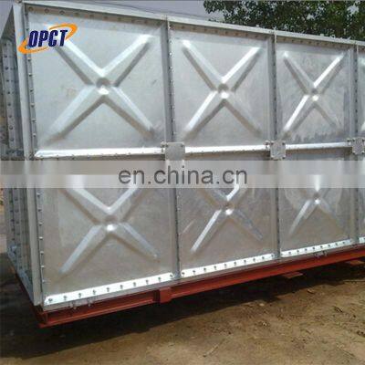 Galvanized steel panel water tank modular HDG storage water tankProduct DescriptionGalvanized Steel Combined Water Tank is punched by Q235A into 1220mm*1220mm or 1000mm*1000mm and 1000mm*500mm, 500mm*500mm standard panels, drilling around, after HDG treatment, assembly at site. When combined, the gap between two standard panels is sealed by silicon pad, connected by bolts.Product nameGalvanized steel water tankMaterial compositionQ235 steelProduct Size0.5*0.5m, 1*1m, 1*0.5m, etcPanel Thickness3mm,2.5mm,2mm,1.5mm, it is different according the size of the tank.Tank Volume1-1000m3Connection wayBoltedEco-FriendlyYesApplicationwater storageProcess techniqueMouldingWater capacity varies from 1.0 cubic meter to 1000 cubic meters, height may reach as great as 5 meters. Inflow, outflow tubes as well as return tube's diameter and place is decided by the designer, passages of at least 7000mm is needed around the tank.Raw material: Q235 steel;Panel size: 1x1m, 1x0.5m, 0.5x0.5m;Process technique: ramming craft;Connection way: arc argon welding;Panel thickness:3mm,2.5mm,2mm,1.5mm, it is different according the size of the tank.1. Easy handle and install,free volume design,no leakage,ideal mechanical structure and meet fire and building standard. 2. Anti-corrosion, anti-aging, no distorsion, no infiltration .3. Easy to clean and conveniently to install and assemble.4. It can storage not only hot water, but also cold water, and has a better shockproof and shock resistant ability.Bolt. nut & washers: stainless steel 304 material.Sealing material: Non-toxic P.V.C foam tape shall be used in between the jointsCovers:The tank cover shall be constructed from 1.2mm to 3.0mm of thickness stainless steel 304 material according to the requirementFlanges :The sectional panels shall be pressed to double flanges at the angles of 45 degree and 90 degree to the face of the plate on four sides.Reinforcement Method :All tanks are internally braced with angle stays to endure the rigidity of the tank when filled with the water. The Top panel is supported by top panel support, which shall be made of stainless steel grade 304 or 316 material according to requirement. Precautions1.When you order should provide water tank size, take over the place, diameter size.2.Water tank can be supporting supply.3.Use water injection temperature for the 4-65 is advisable. Water injection temperature higher than the value can be put forward in order to separately solve.4.Water tank inside and outside of the other welding not welding, prevent damage porcelain face.5.Water tank to the ground under should with structure design personnel for approval shall prevail.6.Water tank should be regularly cleaned, try to prevent water into the trash.ApplicationThis galvanized steel water tank is widely used in storage and regulation of living water supply & construction water supply, and temporary water storage tanks for expansion of the heating system, condensate tank and construction, geological survey, industry, National defense Water, chemical, and so on. Taking flexible, reasonable plate design, suitable for all capacities combined water tank. Suitable for living water with PH value: 6.5-8.5, using life: ≥ 20 yearsRelated ProductsCompany InformationHEBEI DONGDING CHEMICAL TRADE CO.,LTD is made up of several manufacturing enterprises, is a high tech enterprises that collection of sale for project consulting, designed and developed, engineering design, materials purchasing, transport of goods, equipment installation and training debugging, and has passed ISO 9001:2015 international quality management system certification, our company is the national foreign trade, the general administration of customs approved the company has import and export right.We mainly produce potassium sulfate production equipment,FRP tank production equipment,FRP pultruded products(include FRP Square tube/Rectangular tube /Round tube /Rod / U channel / I beam / Flat / Angle /Decking panel /Plum blossom tube /Ladder carling /Ladder crossgirder ),FRP pipe, FRP tank,FRP septic tank,FRP water tank,FRP grating,Cooling tower,FRP scrubber,Cable tray,FRP cover,FRP flange,FRP rock bolt,FRP handrail and so on,Looking forward to your visit and communication!Packing & Shiping>> Packing: According to the order.>> Delivery: Within 15 days after the payment was received.FAQ1. Q: Are you Trading Company or Manufacturing Factory? A: We are both manufacturer trading and company. We have our own factory for almost seven years, and we have better service of overseas customers. Welcome to send your inquiry! 2. Q: I am interested in your products, could I get sample for free? A: We can supply a few pieces FREE samples if we have some in stock, and you only need to pay the freight cost by yourself. Welcome to send your inquiry for FREE samples! 3. Q: How about the Delivery time? A: 10-15days after receiving the deposit based on the MOQ. Normally, 30-35days to finish the order for a 20ft container. Welcome to ask for the detailed delivery time according to your order quantity! 4. Q: How can you guarantee the product quality? A: We have the quality control system ISO9001:2015, and it's been followed strictly. We also have the professional QC team, and each our package worker will be in charge of the final inspection according to the QC instruction before packing. 5. Q: What is about the payment terms. A: Basically, the payment terms are T/T, L/C at sight. Western Union, Alipay. 6. Q: Can you do OEM for me? A: We accept all OEM orders,just contact us and give me your design,we will offer you a reasonable price ASAP.