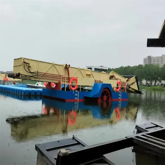 The construction of a large fully automatic cleaning ship adopts a three bar design, corresponding to the front collection compartment, middle storage compartment, and rear storage and unloading compartment. A large operation room is built above the middle storage compartment, which is equipped with an integrated operation platform. The captain can control the entire ship for construction from inside. During construction, our cleaning ship uses a hydraulic system to control the hydraulic cylinder to lower the front collection compartment below the water surface. The bottom shear at the front end starts working under the drive of the hydraulic motor. Its main function is to cut the roots of the water grass. There are two circular saw blades on both sides of our collection compartment, which rotate quickly under the drive of the hydraulic motor. The sharp saw blades are the key to cutting horizontally growing water grass. Not only can it quickly cut off the branches and vines, but it can also clear the path for our cleaning boat to move forward, The saw blade and bottom shear cooperate to carry out the first step of cutting and collecting work. Next to the bottom shear is the collection chain in the front compartment. Driven by the motor, the collection chain starts to rotate and transports the already cut water grass to the storage compartment to complete the collection work. When the water grass or floating objects fill the middle and rear compartments with materials, our ship can sail to the shore for unloading. When unloading, the hydraulic system drives the oil cylinder to lift the rear unloading compartment high, and the chain in the rear compartment starts to run quickly to unload the water grass or floating objects to the shore. This completes the work, and our cleaning boat is then driven back to the construction site for cyclic