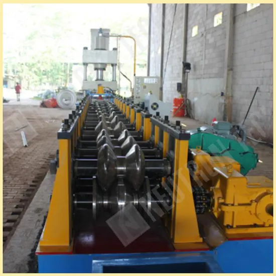 Automatic decoiler - Feeding - Leveling - Punching and cutting - Roll forming - Product packing manually The Structure of Machine Automatic expansion decoiler 1.Double unrolling machine, 2.Adopt automatic expansion system, power 2.2kw 3.Maximum coil weight: 10,000kg, 4.inner diameter: 450-600mm, out diameter max 1900mm 5.with brake system. Feeding & leveling wall plate type 9 rollers leveler, 2 roller feeding, 7 roller leveling. Leveling roller 120mm, material 40Cr, heat treatment HRC48º~52º. Four stand roller to control sheet up and down movement. Power: 11kw, inverter adjusting, speed: 10-25m/min, feeding width max 500mm. Punching and cutting: 1.Use four column type press from Yangli group, equip with punching and cutting die set, fit for 9 or 10 holes. With one set of middle hole punching, cylinder dia 160mm, traveling distance: 60mm 2.Cut to length by encoder: length accuracy 4320±2.0mm, length can set in PLC. 3.Fast feeding unit: after cutting, sheet feeding into roll forming unit, 2.2kw, roller Dia: 120mm, material 40Cr, HRC48º~52º. Roll forming machine 1.Main motor power: 45kw 2.Drive: gearbox driving, 10units, GY230 3.Main shaft diameter: 80mm and 40Cr steel 4.Roller material: GCR15 quenched 58°-62°, chromed 5.Roll station:12 stations 6.Speed: 2-3pieces per minute (4320mm length) Output table Control panel 1.Control system 2.Voltage, frequency, phase: 380v, 50hz, 3phase 3.Automatic length measurement: One-unit tooling of length measuring which is lightly pressed on the surface of the steel sheet; the tolling will roll with the moving speed of the steel sheet and then sense to measure its length. 4.Automatic quantity measurement 5.Computer used to control length & quantity, machine will automatically cut to length and stop when required quantity is achieved 6.Length inaccuracy can be amended easily 7.Control panel: button-type switch, touch screen 8.Unit of length: millimeter 9.Protection function 10.Motor over: Load protection 11.System over: Current protection 12.Short circuit protection e. Additional function Display total length produced Display total quantity produced Display forming speed Product display