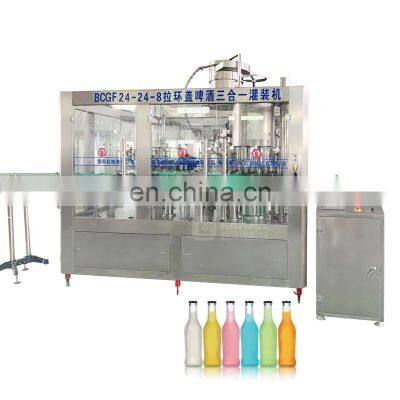High speed 8000BPH automatic carbonated beverage soda sparkling water soft drink filling machineProduct DescriptionMachine description:This DXGF series glass bottle carbonated filling and sealing machine is used to produce beer filling industry. The DXGF series glass bottle carbonated filling and sealing machine can finish all the process such as press bottle, filling and sealing, it can reduce the materials and Outsiders touch time, improve the sanitary conditions, production capacity and economic efficiency. Characteristics:1. Using the wind sent access and move wheel in the bottle directly connected technology; canceled screw and conveyor chains, this enable the change the bottle-shaped become easier.2. Bottles transmission adopt clip bottleneck technology, bottle-shaped transform not need to adjust the equipment level, only change related the curved plate, wheel and nylon parts is enough.3. The specially designed stainless steel bottle washing machine clip is solid and durable, no touch with the screw location of bottle mouth to avoid secondary pollution.4. High-speed large gravity flow valve filling valve, filling fast, filling accurate and no liquid lose.5. Spiraling decline when output bottle, transform bottle shape no need to adjust the height of conveyor chains.6. Host adopt advanced PLC automatic control technology, the key electrical components from famous company such as Japan's Mitsubishi, France Schneider, OMRON. Main machine show: Main technical parameter:Automatic carbonated filling machine production line packaging specificationsMaterial: SS304/316 Bottle materialShapeFilling volumeFilling level(mm)Neck typePET/Glass bottleSquare/round/flat bottle100-2250mlAccording request±1mmAs requiredAdjustable specificationsBottle size: bottle diameter≤110mm, bottle height≤340mmIf using square bottles, then bottle separating system will be addedFilling temperature2℃-40℃level control: float ball and pneumatic butterfly valve.Bottle labeling typePacking system Min, Spec.Palletizing systemManual/ automaticHot melt roll-fedPVC shrink labelFull label/half labelFilm shrink packingRobert packingCarton packing2*3 2*4 3*43*5 4*4 4*5 4*6 6-30bags/minLow positionGantry palletizerRobot palletizerUser Ambient ConditionsTemperature: 2-40℃, Humidity: no dewBottle feed-inConveyor with screw for glass bottleAdopt air-conveyor for PET bottle DetailsWashing Part:The grippers take the bottles from the inlet star-wheel while they are still driven by the star-wheel, thus guaranteeing a safe grip. After the gripping, the bottle is turned upside down with 180 degree and cantred above a spraying nozzle which directs a stream of rinse water into the bottle. After the draining period the bottle is turned over to an upright position againFilling part:Long tube filling type with 2 times filling process to make sure perfect filling level Liquid tank, filling valves, controlling rings, upgrading cylinder.High speed and mass flow filling valve ensures the high filling speed and exact fluid level. Parts contacting liquid are all made of excellent stainless steel or food grade engineering plastic. Capping Part: Rotative capping turret, suitable to the application of screw plastic caps on PET bottles The fixed part consists of the cap hopper, the cap feeder with relevant motor and the cam actuating the capping heads. The heads are raised and lowered by the action of a follower that is riding on a shaped cam.Conveyor system Conveying path support on the ground by tripod, driving motor adopt frequency control, it connects with washing filling and capping 3 in 1 machine and keeps pace with it. The filled bottles are conveyed by the conveyor system. Driving system is running by a main motor that adopts gear drive mode. Related productGlass bottle washing machine The bottle cleaning process is as follows: enter the bottle - soak spray - internal brush - the bottle is filled with clean water spray - drain - out of the bottle. Carbonation drink mixerProcess: Water, syrup, CO2 mixing systemCarbonation mixer: 1500L/Hr, 2000L/Hr,3000L/Hr,5000L/Hr,etc. Co2 content is from 2.0-3.8Water chiller: working with carbonation mixer, the cooling medium of water chiller going to heat plate exchanger of carbonation mixer to cooling carbonation drink to 3 degree to 8 degree Soda water mixing systemProcess: Sugar melting boiler or High level cutting tank, double filters, syrup pump, blending tank, stroage tank Syrup melting boiler: 300L/Hr, 500L/Hr, 1000L/Hr,etc,Blending tank: 1000L/Hr, 2000L/Hr, 3000L/Hr, etc, Storage tank: 1000L/Hr, 2000L/Hr, 3000L/Hr,etc. Automatic sticky / wet glue labeling machineLabeling speed: 60~100B/MinLabeling precision: +1mmBottle size Height : 40mm~~250mm Diameter:20mm~~110mm(customized)Label size:Height :10mm~~150mm Length :15~~300mm(customized)Inner diameter of scroll :Φ76mmOuter diameter of scroll:Φ300(Max)Company InformationProject casesOur exhibitionOur teamFAQQ1: How to find suitable machine or complete beverage production line?A1: Looking for beverage filling machine in www.grandeemachine.en.china.cn •Enquiry: Contact us by email, phone call, fax, Instant Messenger (Trade manager, Skype, WhatsApp, Wechat) and let us know your requirements • Discussion: Specify the items and what are you exactly looking for. Q2: Are you a trading company or a manufactory?A2: We are the manufacture of water/beverage filling machine and water treatment system over 10 years.We just not only sell drinking water machines and other related equipment , Quality is our culture. We have rich experienced engineers with technicians working team , providing good and after-sales service term , professional salesman terms . Q3: Do you have technical support after we purchased your machines?A3: We will arrange our professional technical to go aboard to your factory, they will help you and teach you how to install and maintenance the machines which you purchased. Or help you to fix machine when it has problems. Q4: If you 