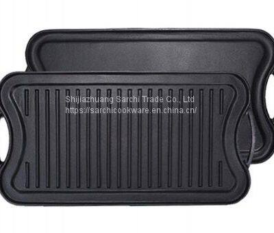 This cast iron rectangular griddle is Sarchi’s best-selling griddle as well as the market’s hot-selling product. Usually, we have two sizes. Other sizes can also be customized according to requirements. This kind of long griddle pan has a large cooking surface and can be used at a time. Turn on two burners at the same time to make breakfast for multiple people, and this griddle pan is double-sided, and both sides can be cooked. One of the raised ribs on the cooking surface is very suitable for burning meat and keeping food away from excess fat. , The meat made is full of color and flavor. The other surface is flat, and fried eggs and toast are handy. Two symmetrical auxiliary handles make it very convenient to move the baking sheet. Its use is more extensive, whether it is at home or outdoors, it is very convenient to use.