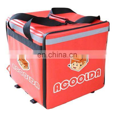 Product DescriptionProduct Model:ACD-B-001Size&Capacity:Outer size:40*40*42CM Inner size:38*38*40CM 67LMaterial:Outside 500D PVC+5mm insulation foam+Aluminum foil lining+PVC zipper+ Food grade hollow plateColor: Black ,red ,orange,blue,yellow, green or custom colorMOQ:300PCSCarton package size:42*48*60 5pcs/ctnsDelivery date:30 days for mass productionLOGO:could be customerized if meet our MOQOEM/ODM:WelcomeOEM sample time:around 7-10 daysPayment:Trade Assurance/ 30% for order deposit, 70% blance before deliveryFeature:1.Backpack and handle design.2.Large capacity.3. The thick 500D PVC +5mm insulation foam4.aluminum interior providing an extra layer of heat reflection, will not retain moisture or odors.5.This delivery bag is collapsible and easy to disassemble.6. Custom logo and colors.use way:On bicyle,on car,hand,liftCan be use as cooler bag or keep hot bag for pizza,cake,fast food delivery or keep fruit fresh and cans drinking cool.1. Shoulder Strap: With padding and is comfortable.2. Waist belt: Can carry better.3. Foam padding: feel more comfortable when carry.1. Plastic foot feet: To anti dirty & stand stable.2. D ring : Can use the elestic to help fixed on the bike/motorcycle.3. Belt and buckle system: Design for fixed on the bike/motorcycle.Backpack Design Handle DesignRelated ProductsCompany IntroductionFAQ