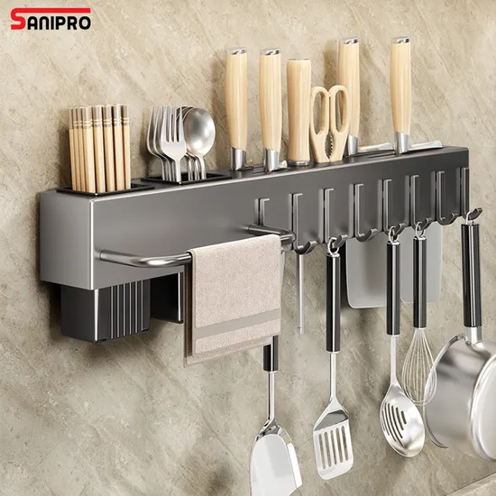 Sanipro Wholesale Wall-Mounted Storage Organizer Chopsticks Tube Kitchen Knife Holder Spoon Utensils Rack with Towel Hanger