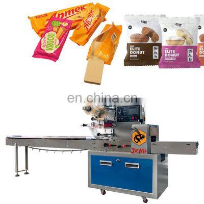 Esay setting horizontal packing machine for small wafer biscuit cookie packing machine cake donuts packing machineProducts DescriptionThe JK-B model flow packing machine features quick, easy changeover and adjustment that minimizes product and film waste and reduces maintenance costs.The machine working starts with a cylindrical roll of film. The flow wrapping machine will transfer the film from the roll and through to the forming collar (sometimes referred to as tube or plow). At the same time, a conveyor has lined up individual products for wrapping. The film is fed through the collar and the product is surrounded with film, sealed and the film is then cut. The finished individual product is then gathered downstream to be bagged or cartoned prior to boxing and palletizing.Automatic flow packing machine is a widely used packing machine. Suitable for all kinds of product packaging. Including medical supplies, vegetables and meat, baked bread, snacks and candy, daily necessities, hardware accessories, etc.Main Features1.Dual frequency conversion control, Bag length can be set and cut in one step, saving time and film.2.Interface features easy and quick setting and operation.3.Self failure diagnosis, clear failure display.4.High sensitivity photoelectric eye color tracing, numerical input of cutting sealing position for extra accuracy.5.Temperature independent PID control, more suitable for packaging different materials.6.Positioned stop function, without sticking knife or wasting film.7.Simple driving system, reliable working, convenient maintenance.8.All control is realized through software, easy for function adjusting and technical upgrade.Machine Working Process1st step: Put the packaging film on the holder and wear the film as required.2nd step: Setting the parameters you want by touch screen.3rd step:Put the materials to be packed on the conveyor belt4th step: The bag former will make the bag automatically.5th step: The horizontal and vertical cutter device will seal the middleand of the bag.6th step: You will get the nicely paper or plastic bag type.Why Choose UsJIKE BEE MACHINERY has a professional team to provide customers with various packaging solutions. Fully understanding the needs of customers,engineers design the most suitable solution. We have our own processing and assembly workshop and quality inspection and debugging process to ensure the quality of the machine. After acceptance by the customer, they are packed in international standard wooden cases and shipped.We will package the machine's instruction manual and a USB flash drive with machine operation videos together with the machine.Ensure that you can use the machine as soon as you receive it. If you have something you don't understand, our after-sales team will also help you answer in time.Our customers have covered more than 80 countries around the world.And give us unanimous praise.Company ProfileFoshan Jike Bee Automation Equipment Co., Ltd. is a manufacturer of automatic packaging equipment.We are a production-oriented enterprises focused on product innovation, factory direct sales and perfect after-sales service in one.The automatic packaging equipment for granule, powder, liquid and sauce produced by the JKMF company is at the advanced level of the industry,it can be customized production automatic material packaging line for all kinds of products .Mainly applicable to: food, hardware, drugs, daily chemicals, pesticides, fruits and vegetables, cosmetics, other industries.The company has its own patent and product technical certification, which can bring customers high quality equipment and worthy of customer trust.CertificationsFAQQ1:Do you have manual or operation video for us to know more about the machine? Yes, not only manual or operation video, 3D drawing also available to make as per your design,also the video we can make of testing the material from our packaging machine if your packing goods easier for us to find from our local market. Q2:How can I trust you for the first time business ?Please note our above business license and certificate. And if you don't trust us, then we can use trade assurance service, guarantee your money, and guarantee your machine's on-time delivery and machine quality.Q3:Is engineer available to serve oversea?Yes, but the travel fee is paid by you. So actually to save your cost, we will send you a video of full details machine installation and assist you till the end.Q4:How can we make sure about the machine quality after we put the order?Before delivery, we will send you the pictures and videos for you to check the quality, and also you can arrange for quality checking by yourself or by your contacts in China.Q5:Will you provides the door to door service?Yes. Please offer us your final destination, we will check with our agent to see if it available, and most of the area is ok for us to clearing and sending in your countries.