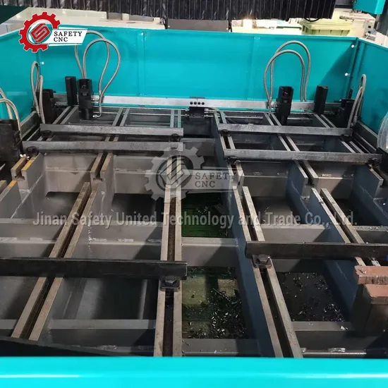 7. On the working table the clamping system adopts 12 sets of hydraulic automatic clamper, the maximum overlapping clamping thickness goes to 100mm. The button control improves production efficiency.
