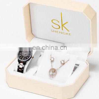 Product DescriptionProduct Features*BrandSK (SHENGKE)*StyleFashion&Luxury*ModelK0075L-set*MovementJapan Quartz SEIKO PC21*Battery life18-20 months *Water proof30 meters/ 3ATM*Watch diameter /thickness 36mm/9mm*packagingDismountableRelated ProductsCompany IntroductionGuangdong Yonghong Watch&Clock Company, founded in 1996 with more than 25 years manufacturing experience in watch industry.Guangdong Yonghong is a comprehensive enterprise intergrating R&D, design, manufacturing and sales. In order to build up a strong and competitive production capability company, in 2004, Yonghong built a 26 thousand square meters modern industrial park. After industrial upgrade and modernization, Yonghong now have 80 professional watch makers and a mature quality control team. At present, the capability can reach 200 thousand pieces every month.Yonghong creative design team with the aim to produce watches that can become best sellers among different markets around the world, these designers provide amounts of new impressing models every month. The design team so far had provided over 2000 designs in total to support OEM and ODM department.As a professional watch manufacturer, Yonghong definitely worth your trust because Yonghonger always believe in one rule: To pursue high quantity and high cost performance production for clientsOur Services & Strength We offer OEM & ODM watch , wholesale watches ,we had serviced many clients to strong theirbusiness from different countries ,our watches quality ,style , price were got high praise from clients ,if you want to find afactory to custom your logo watches , we will be best supplier for you .FAQ 1.What is your MOQ (MOQ=Minimum Order Quantity)?If you order our brands watches , no MOQ limited , any quantity you want is ok , if customize with your logo watches ,MOQ is 300pcs 2.Can you provide sample first before I place mass production order?Yes, we can provide samples for your reference, and the sample fee will be returned to you when you order mess bulk products which reaches minimum order quantity 300~500 pieces3.How about your products quality?Our quality had praised so many clients , quality advantage as below :1)All our SINOBI and Shengke (SK) watches are at least 3ATM water resistant, 100% tested by Waterproof Testing Machine.2)All our brands’ watches are vacuum plated,color would last at least 1~2 years.3)For OEM or ODM watches, we will produce the watches as your requirements. It can comply with CE&RoHS, etc. You can arrange yourQC team or hire the third party to test the watches before delivery.4.How long is your warranty time?All our Sinobi and Shengke (SK ) brands watches’ movement is 12 months warranty.5.What's the delivery time?If take our brand logo watches, the delivery 3~7 days after paymentFor OEM orders, the delivery time is : alloy case watches 20~25 days , stainless steel case watches 45~50 days6.How about shipping methods?If you have a courier in China, goods can be sent to your courier after payment.If you have no cooperated courier, we will check the shipping details and cost for you after your final order is confirmed.7.Are you factory or trade company?We are factory (in Guangzhou ,China),welcome to visit our factory, if you are interested in our factory ,please contact us formore details.