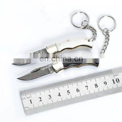 Damascus folding blade knife key chain mini pocket knife horn and bone handle